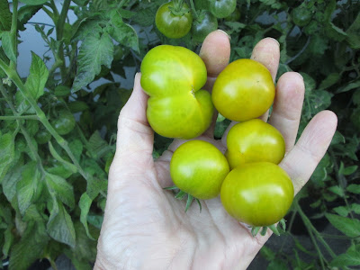 a few larger Blood Moon added to the mix ...... Blood Moon is a very tasty tomato - another Brad Gates introduction from Wild Boar Farms cross of Pink Berkeley Tie-Dye and Blue Beauty; wish there were more of them